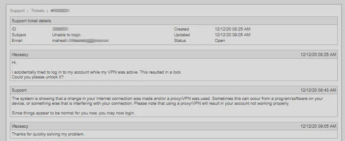 To test out the support experience, I decided to lock my account, so I can ask for their help. For this, I tried to log in to my account with VPN, which automatically locked my account. Then, I contacted them via a support ticket.